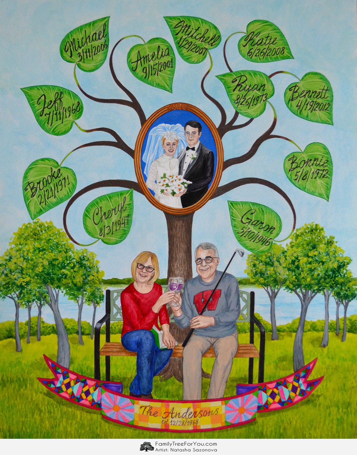 While it seems that the majority of people who love golf are men, in reality it’s not the case. There are plenty of women who love golf just as much as men do. That was the case for one couple I created a personalized family tree for. Golfing became the main theme for the whole painting. The family tree was commissioned by the couple’s son and he informed me that both his parents love golfing. I proposed to him that we depict his parents inside a golf cart. It worked out rather well as you can see in the painting below: