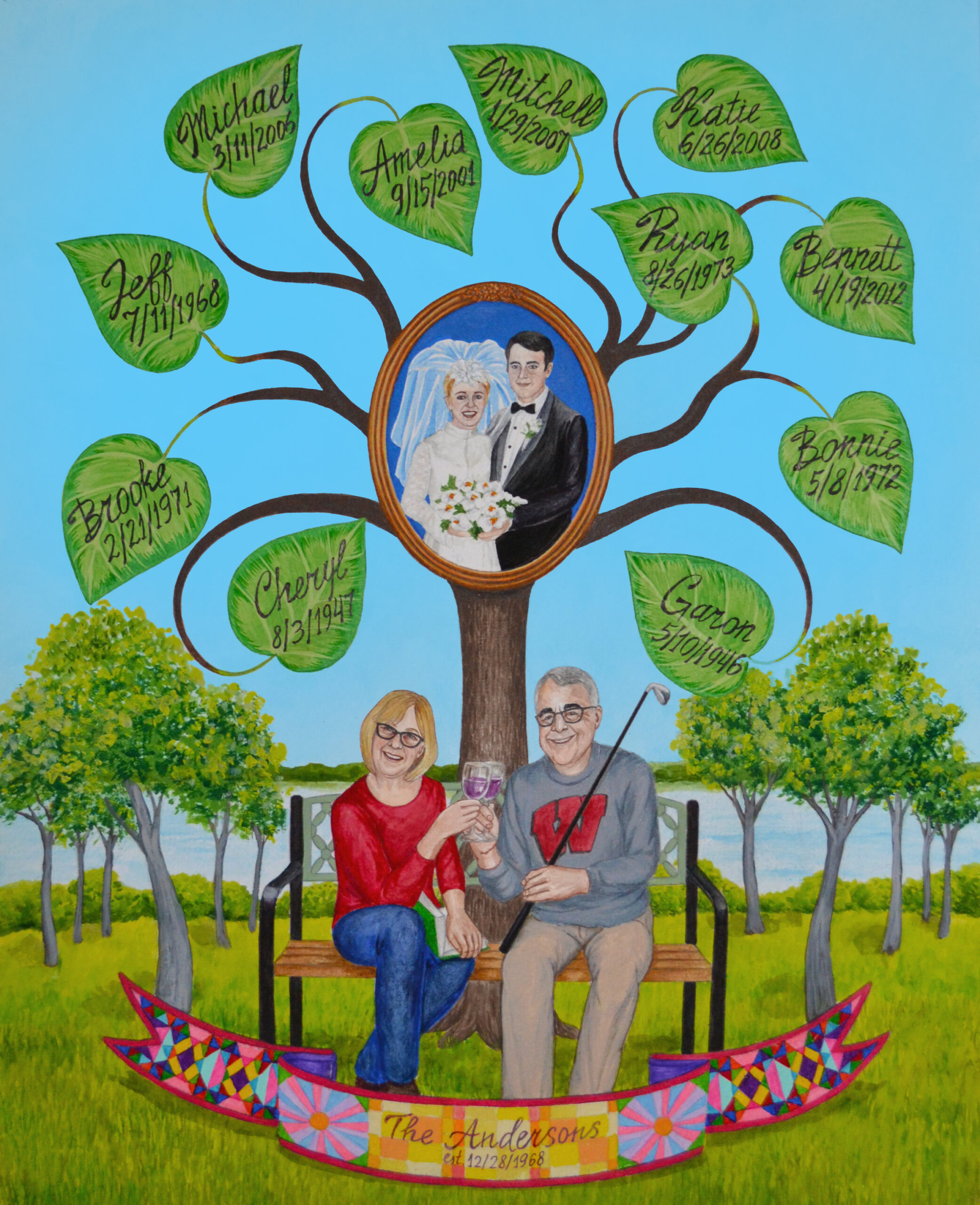 The challenge of creating a unique illustration for such a romantic occasion sparked inspiration when the client shared that her mother adores quilting. Instantly, I envisioned transforming the traditional family banner—featuring the couple’s last name and wedding date—into a vibrant quilt pattern. Painting this intricate banner was no small feat; ensuring the symmetrical “patches” aligned perfectly tested my precision, but the result was a dazzling focal point that added a bold pop to the artwork. Subtle colors throughout the rest of the painting, including portraits of the couple and their children’s and grandchildren’s names on delicate leaves, allowed the quilted banner to shine, balancing elegance with emotional resonance. To add a celebratory touch. I painted the couple toasting with champagne.