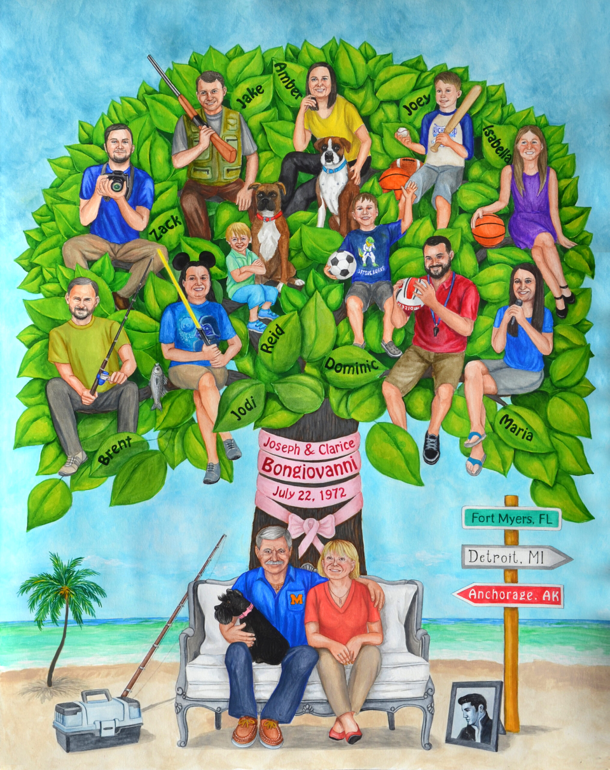 Vibrant and full of life, this artwork features the rest of the family members perched on the branches of a beautiful tree, each engaging in their favorite activities, such as fishing, playing sports, or taking photos reflecting their passions. Everyone’s names are inscribed on leaves, while a banner on the trunk proudly displays the couple’s names and anniversary date. A road sign highlights geographical locations dear to their hearts, adding a personal touch.