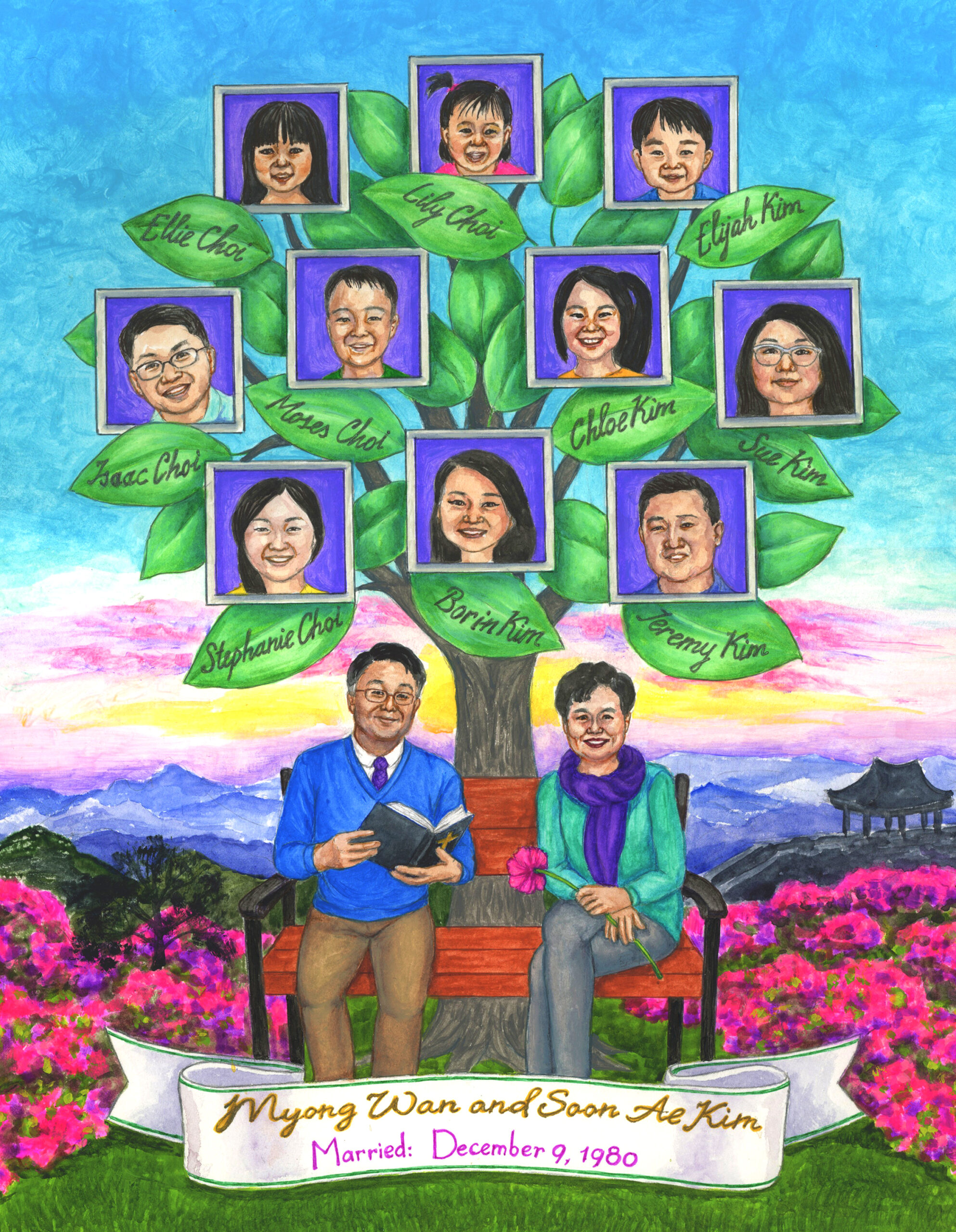 The painting’s background featured South Korea’s breathtaking mountains, painted in soft purples that echoed through the portraits of the couple’s children and grandchildren, creating a cohesive, colorful composition. The parents, dressed in hues complementing the landscape, sat on a bench at the heart of the family tree painting, their true legacy ‘blooming’ on branches as portraits of their loved ones.