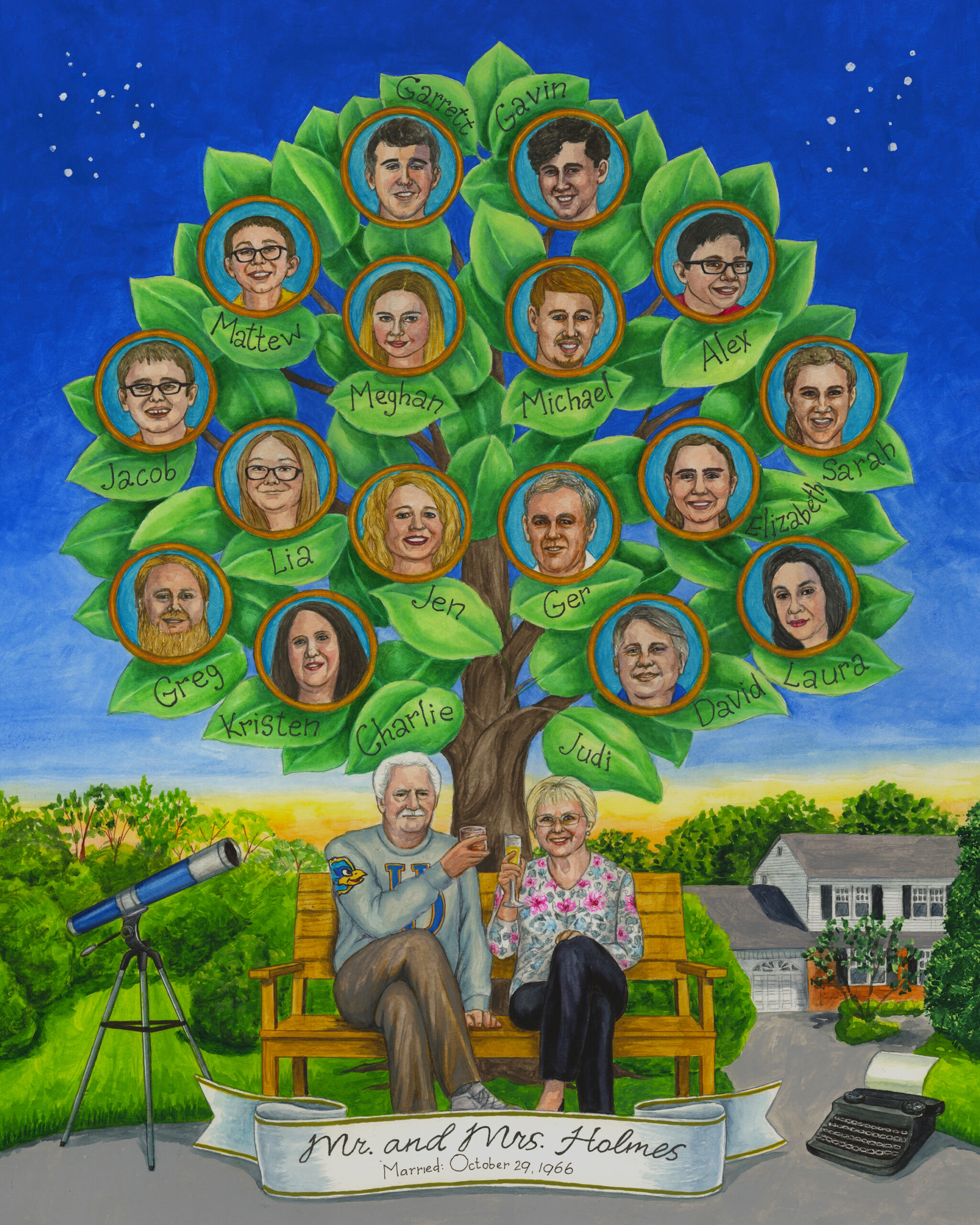 Commissioned by a client in the UK for her father in the US, this hand-painted artwork became a cherished 80th birthday gift for dad, capturing his life’s story with heartfelt artistry. This unique painting stood out for its celestial theme, marking my first use of a starry night sky. At the client’s request, I placed a telescope beside her father, tying the scene together with constellations reflecting the couple’s sun signs – a whimsical, personal touch that elevated the artwork’s meaning. The family tree, adorned with headshot portraits of his children and grandchildren arranged chronologically on the branches, showcased his thriving legacy. A banner at the base, inscribed with the parents’ names and wedding date, added a timeless touch, making the artwork a true family heirloom that will be passed on to future generations.