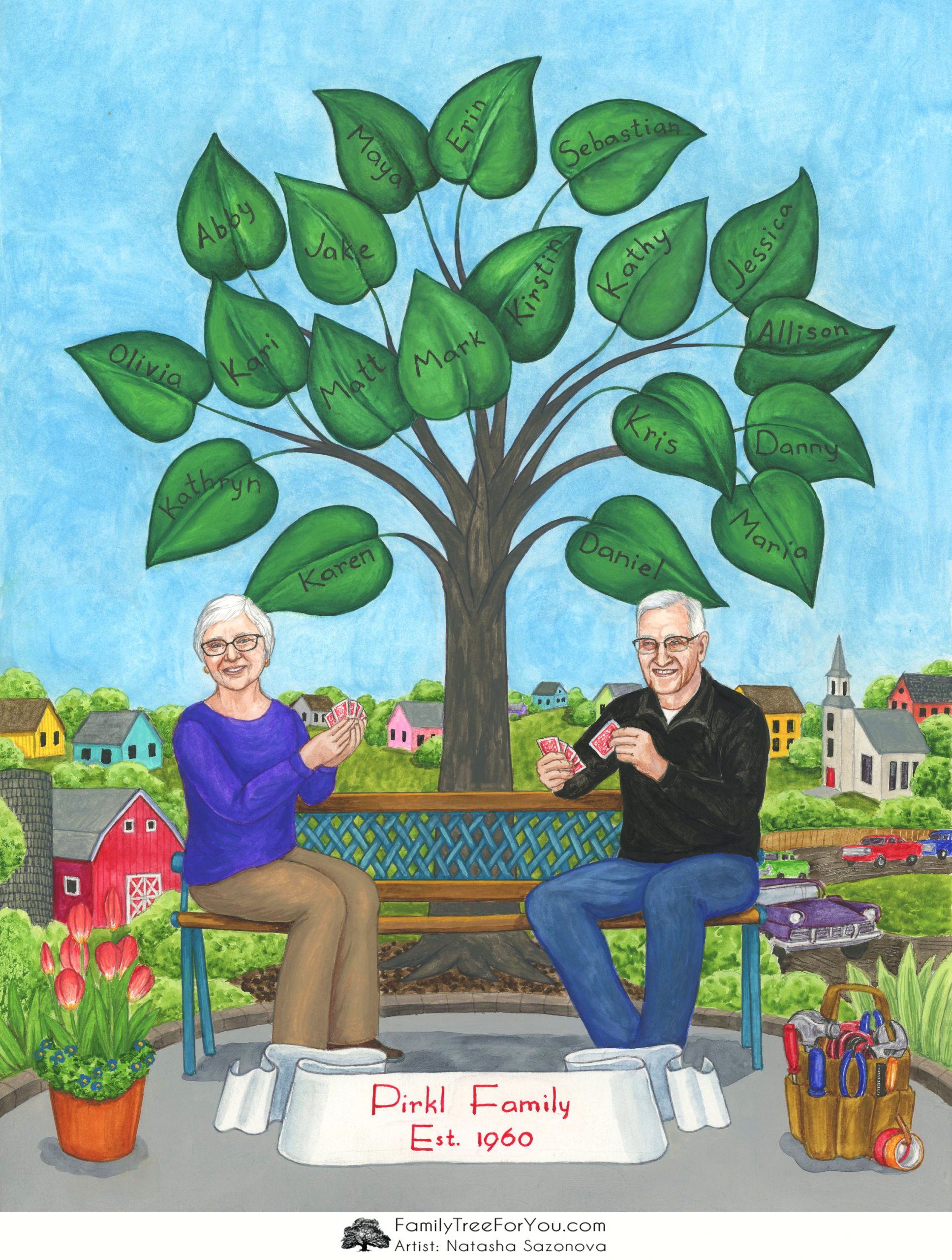This heartfelt illustration, commissioned by a daughter for her mom and dad’s joint 80th birthdays, brought their personalities to life in a way that made it a deeply sentimental birthday present. For her father, a former racer, I painted a dirt race track in the background, paired with a toolbox to reflect his hands-on hobbies. Her mother’s love for gardening came alive with a flower pot by her side. Capturing their shared hobby, I depicted the couple playing cards – their favorite pastime. The family tree was set against a charming country town with a church and red barn, as my client requested. The family tree’s leaves bore the names of their children and grandchildren, thoughtfully grouped by family branches, symbolizing their thriving family legacy.