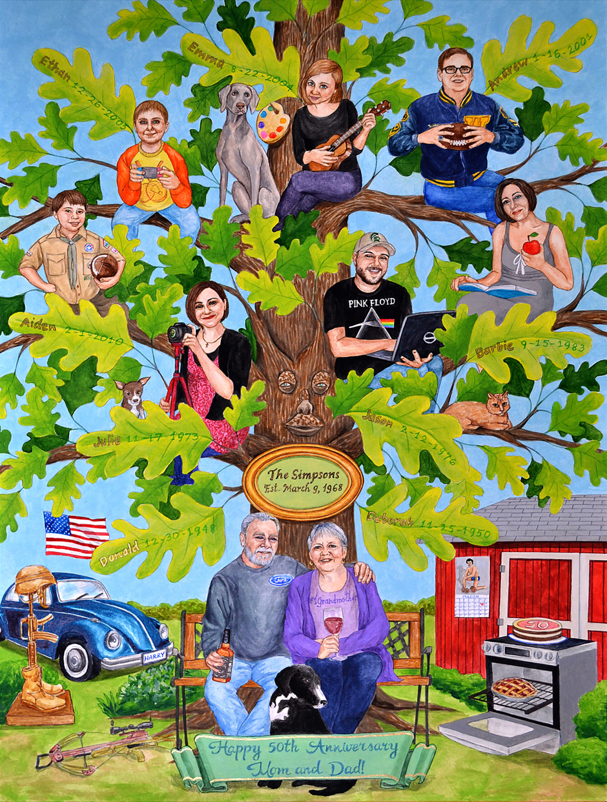 My Custom Family Tree Art goes beyond traditional genealogical charts, weaving portraits, names, and birthdays into a vibrant visual record that celebrates a family’s unique story. Designed to foster a sense of belonging and preserve heritage for future generations, each painting captures the individuality of family members through their hobbies, passions, and shared love. This approach transforms a family tree into a meaningful 50th anniversary gift for parents, as seen in one of my favorite commissions, crafted to honor a couple’s golden milestone with extraordinary detail and sentiment.