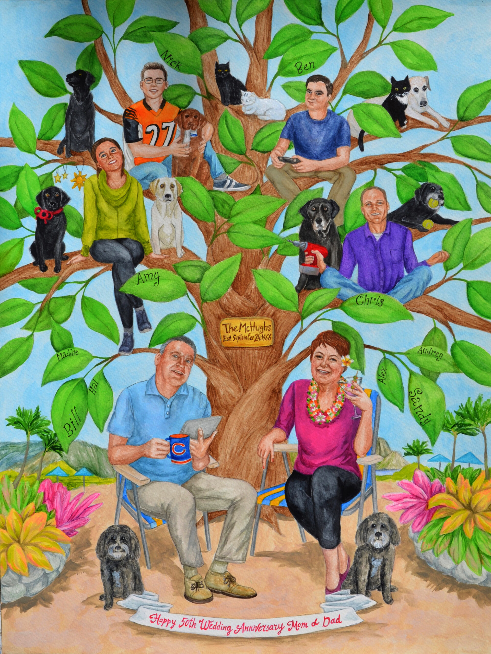 This lively watercolor, commissioned for a couple’s golden anniversary, blooms with the spirit of Hawaii. Against a lush backdrop of swaying palm trees and vibrant island plants, the couple lounges in lawn chairs at the base of their family tree, flanked by their two loyal dogs. Above them, their daughter, son-in-law, and grandsons perch on branches, joined by their own pets (both cats and dogs), creating a joyful family tableau. A plaque on the tree trunk proudly displays the couple’s wedding date, anchoring their special milestone in aloha spirit.