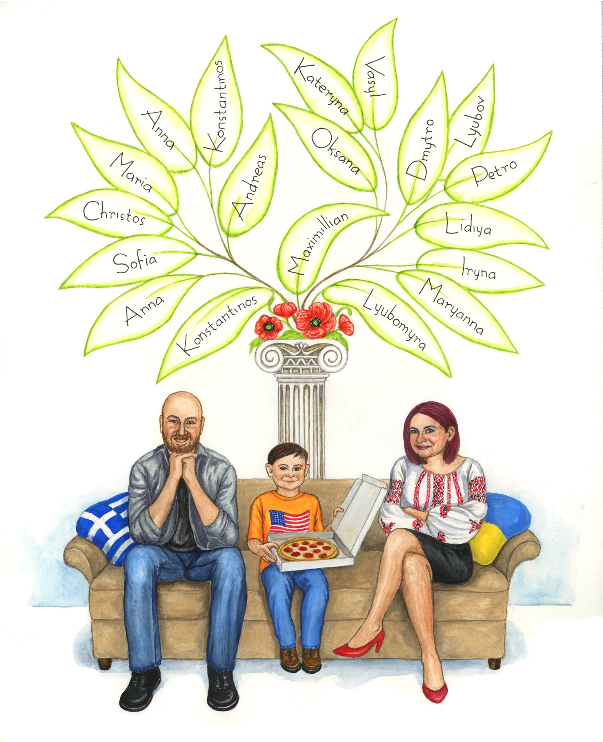 Commissioned to honor their unique bond, this artwork captures the essence of this couple’s love story. The Ukrainian wife was depicted in a traditional vyshyvanka blouse, seated on a couch with a blue and yellow pillow echoing Ukraine’s flag, a vibrant nod to her homeland. Poppies, iconic symbols of Ukraine, bloomed from the tree, tying her heritage into the design. Her Greek husband sat beside a pillow with the Greek flag, while their son, wearing an American flag t-shirt and holding an open pizza box, a tribute to their family’s pizza restaurant. To unify their Greek and Ukrainian roots, I crafted the tree trunk as a Greek Ionic column, with decorative leaves bearing family names, creating a striking fusion of cultures.