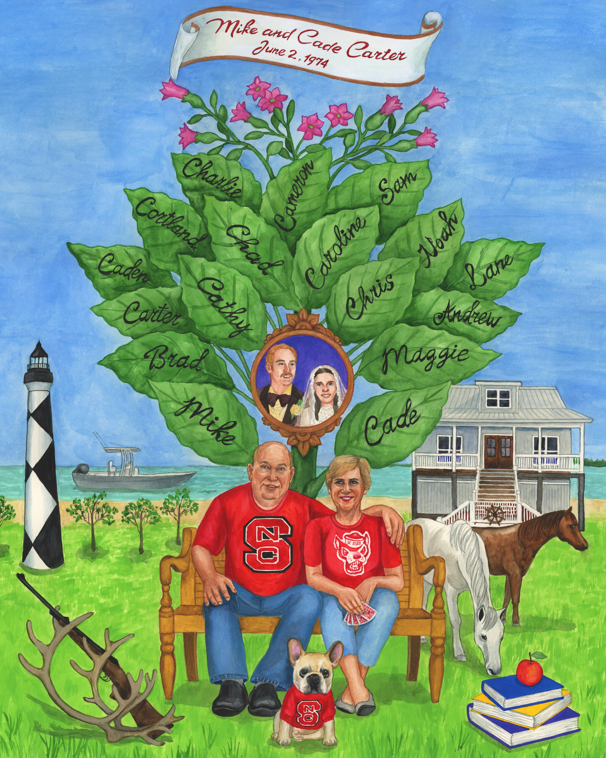 The client wanted a creative reflection of her parents’ life story, so I painted her father, a former tobacco farmer and deer hunter, next to a rifle resting against deer antlers. Her mother, a retired teacher, sat beside a stack of books topped with an apple, a nod to her classroom days. Both parents, passionate NC State University fans, wore the school’s t-shirts, as did their adorable family dog, adding a spirited touch. The background featured their beach house and a nearby lighthouse, anchoring the scene in their coastal haven. I included their family boat and even two horses from my client’s childhood, weaving nostalgic details into the composition. I inscribed the names of the couple’s children and grandchildren on the leaves of a tobacco plant in full bloom.