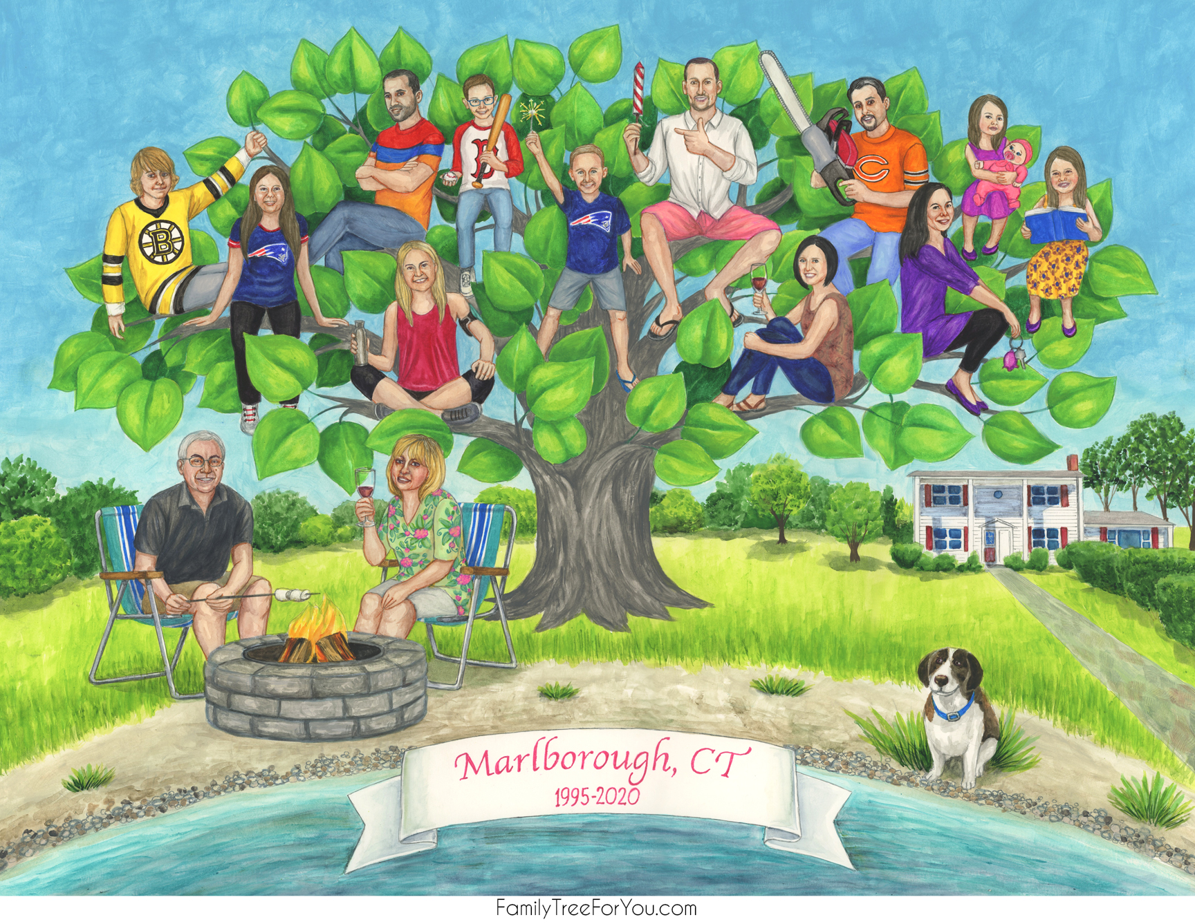 The layout echoed my traditional family tree designs but with a creative twist. I placed the moving couple at the base of the tree, seated by a fire pit that held cherished meaning, a spot where the neighbors gathered countless times. Their family home stood opposite, with their beloved, recently deceased dog adding a poignant touch. Instead of a family name, a banner in the foreground bore the town’s name and the years they spent there, anchoring the artwork in their shared history. The town lake, painted in the background, wove the scene together, reflecting their community’s spirit.